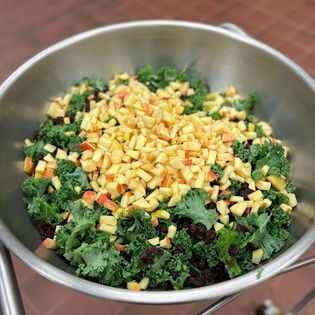 This side salad does not need to be batched for lunch service. Kale has sturdy leaves that benefit from being dressed ahead of service. The dressing also keeps apples from turning brown and the craisins juicy and soft.