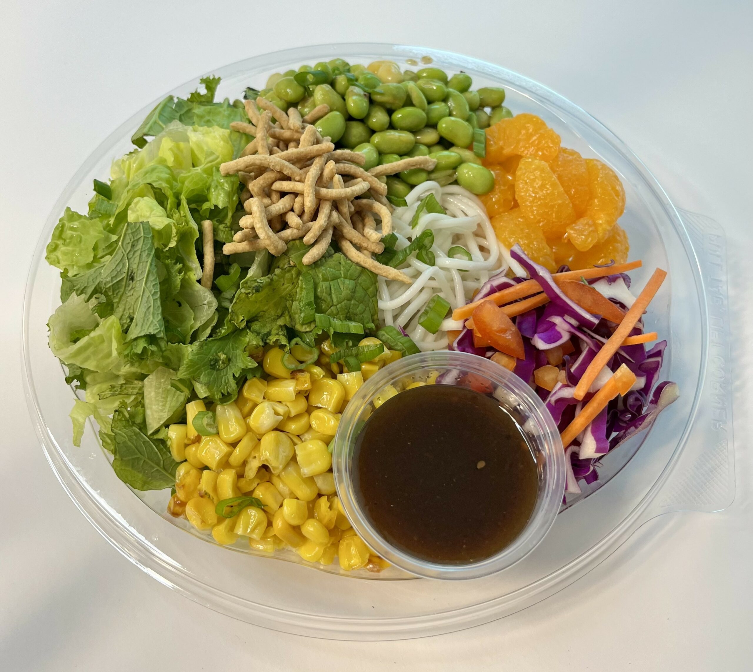 - 1 cup of romaine/mustard greens, ½ cup edamame, ½ cup corn, ½ cup slaw mixture, ¾ cup (2.5 oz) noodles, 1.5 oz. dressing.