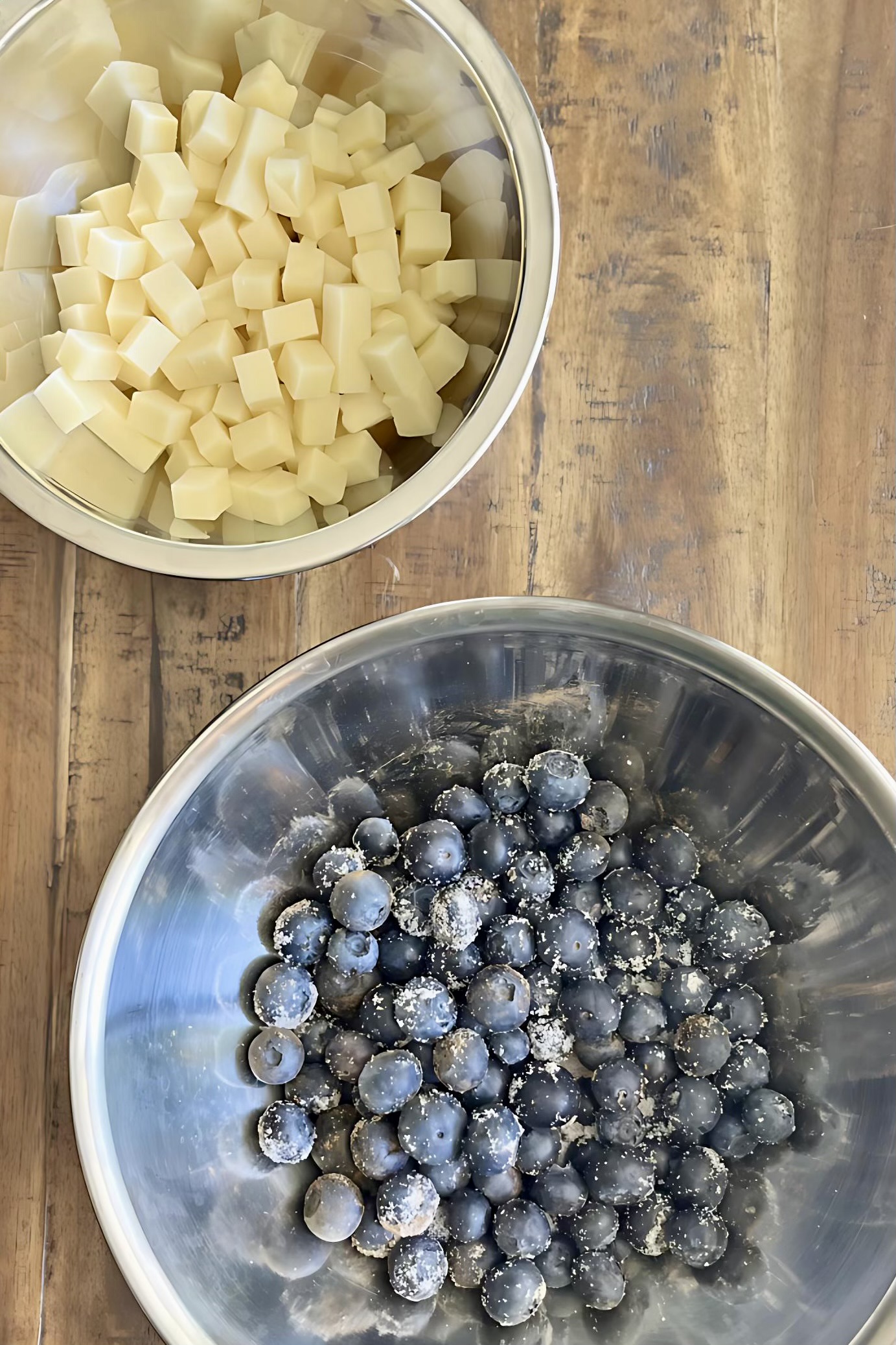 - While the dough is rising, prepare the blueberry filling by mixing blueberries, sugar, cinnamon and cheese in a large mixing bowl.