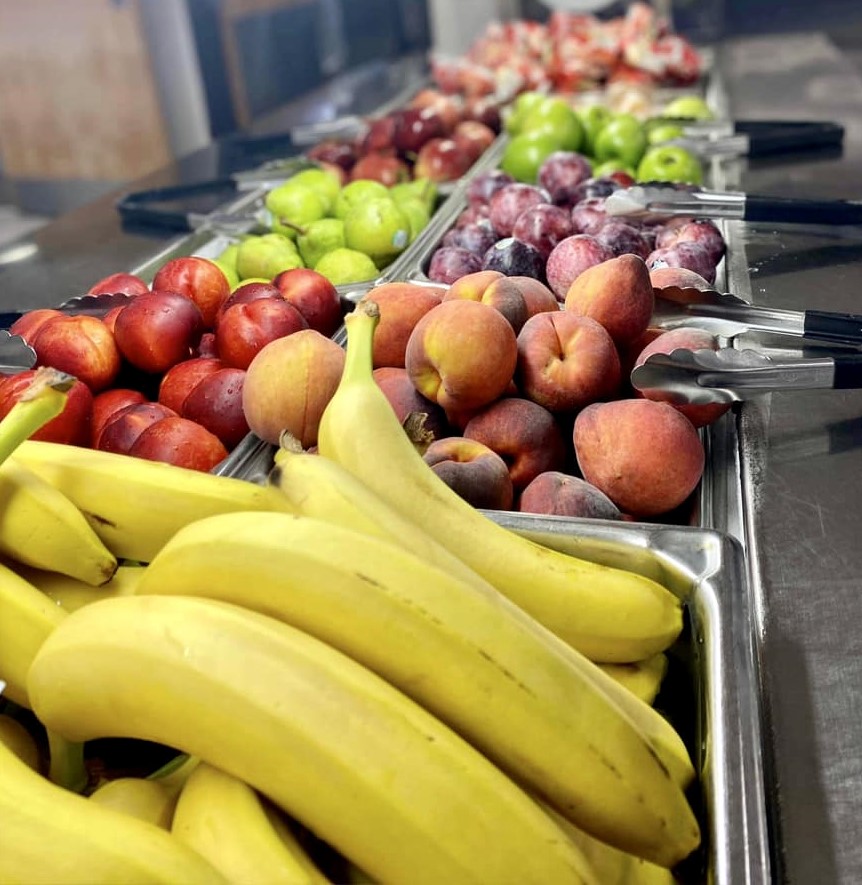 Fresh fruit in 4-inch half hotel pans for service.