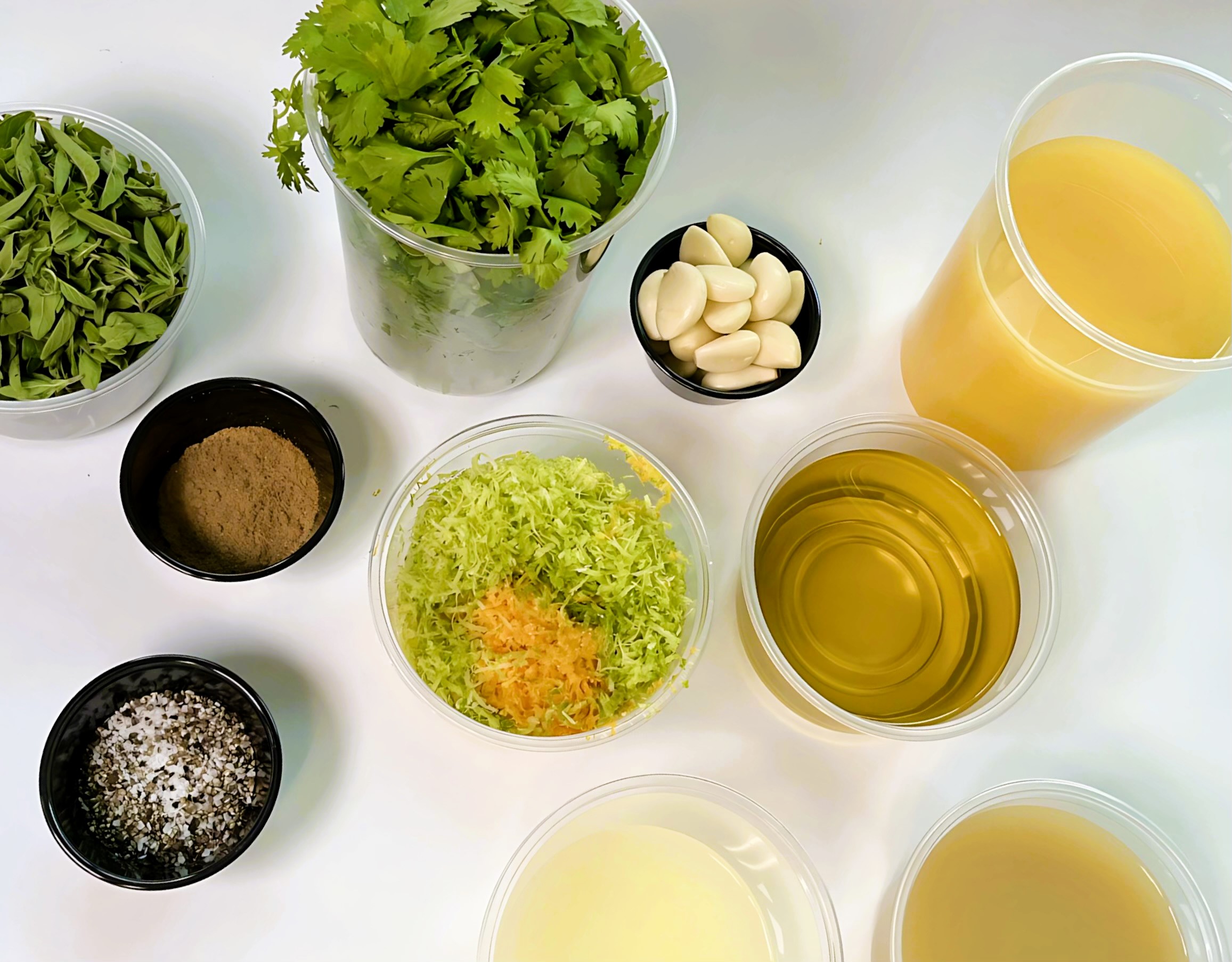 Add some of the orange juice to garlic mixture. This will help the herbs chop easily.