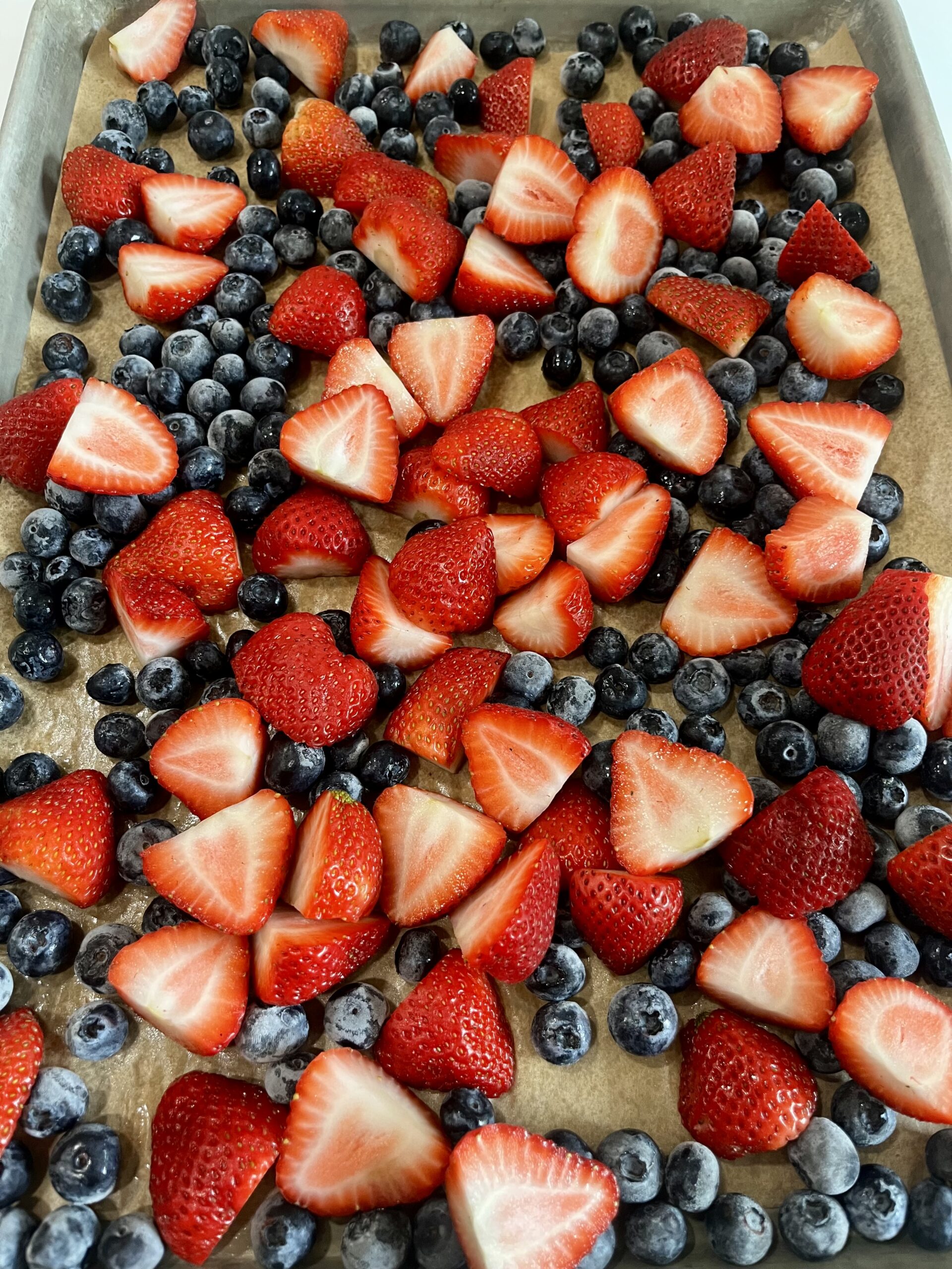 - Spread the berries in an even layer. Take care not to overcrowd the pan or your berries will not roast well.