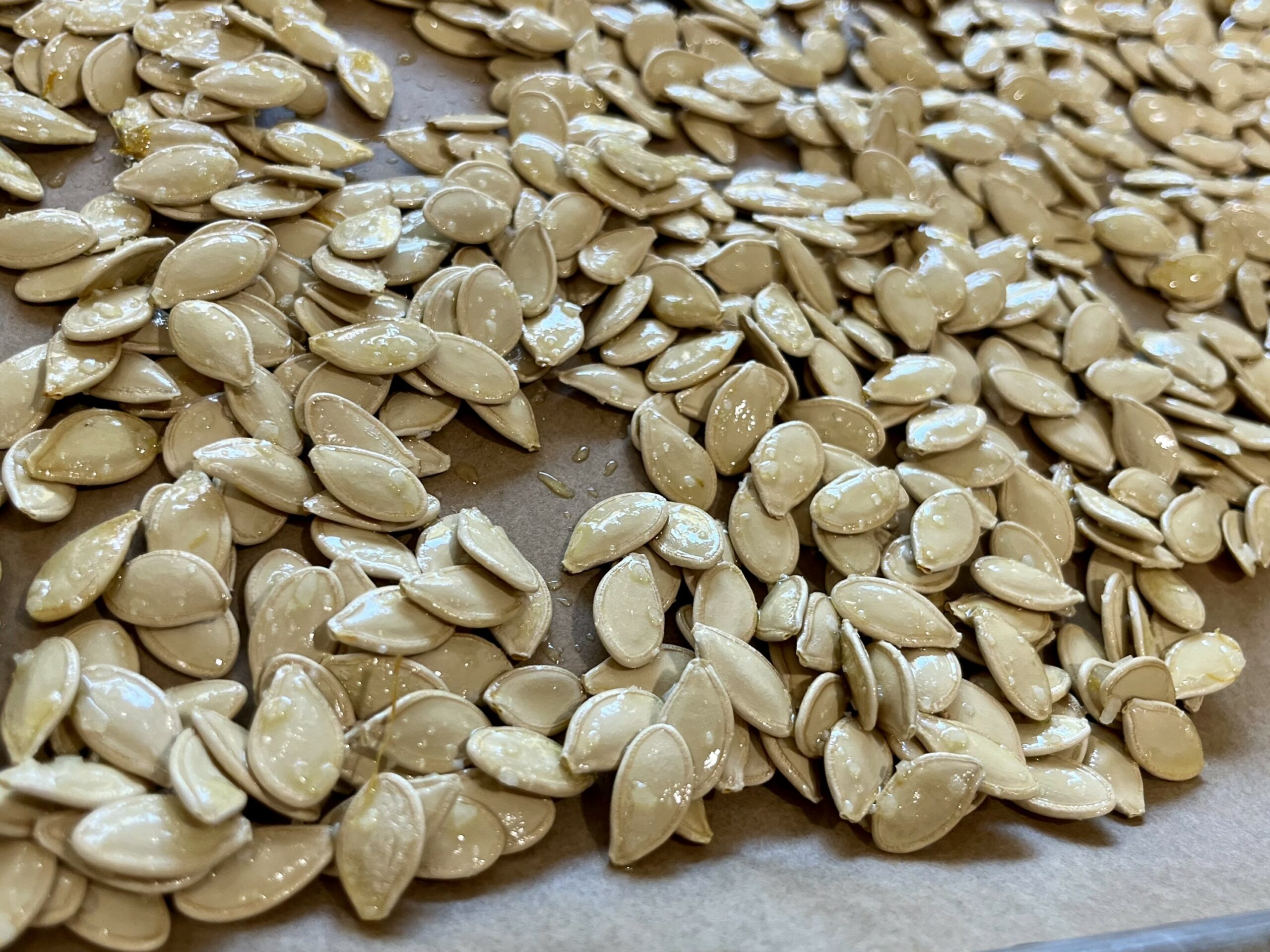 - Spread the pumpkin seeds in a single layer on a parchment-lined baking sheet. Roast at 350°F for 12–15 minutes, stirring halfway through to ensure even browning.